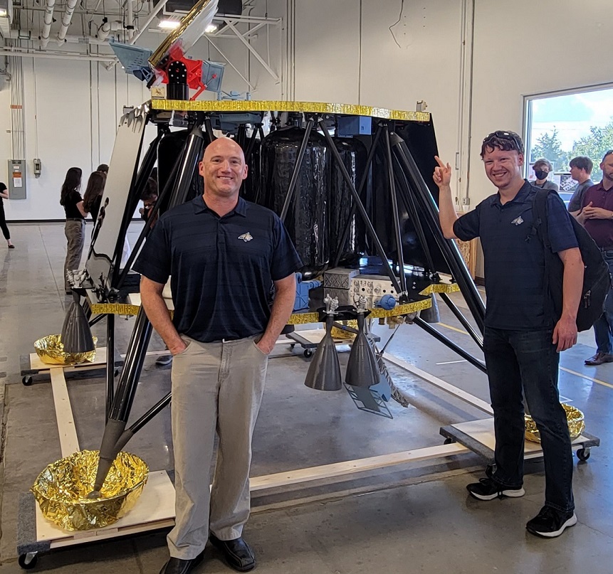 The Firefly Blue Ghost Lunar Lander will be carried into space by a SpaceX Falcon 9 Heavy Rocket. It will then take 45 days to get to the Moon and land. Here is what the lander looks like. A RadPC mock-up is mounted to this lander prototype. It is the little blue box being pointed to by MSU PhD student Chris Major.