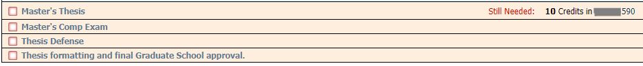 Master's students writing a formal thesis are required to go through the Graduate School formatting procedures. These students will be enrolled in 10 credits of @590 courses in their discipline and should see a line item in DegreeWorks that indicates formatting is required.