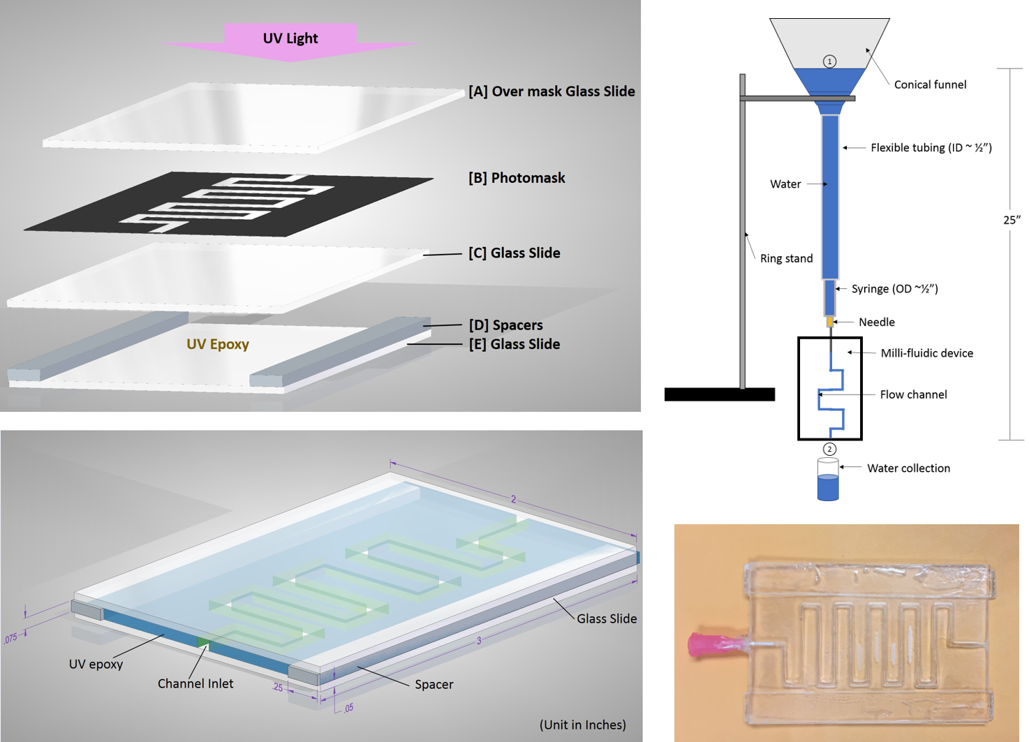 The devices are made in-house with support from the Montana Microfabrication Facility. Students use tubing and funnels to set a driving force, and the flow rate of collected water can be measured. With this information, students can assess friction in the system, such as that caused by bends. These efforts are detailed in an ASEE paper.